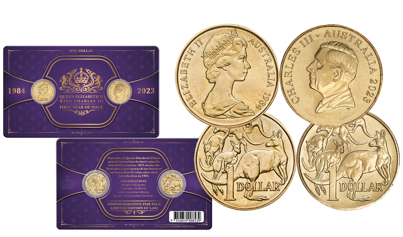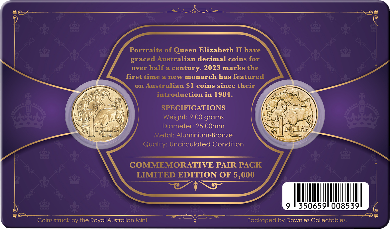 A crucial acquisition for every collector, this limited edition set unites the FIRST Australian $1 coin of Queen Elizabeth II with the FIRST Australian $1 coin of her son and successor, King Charles III!