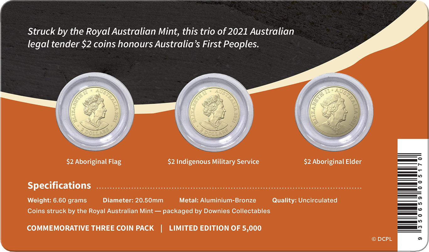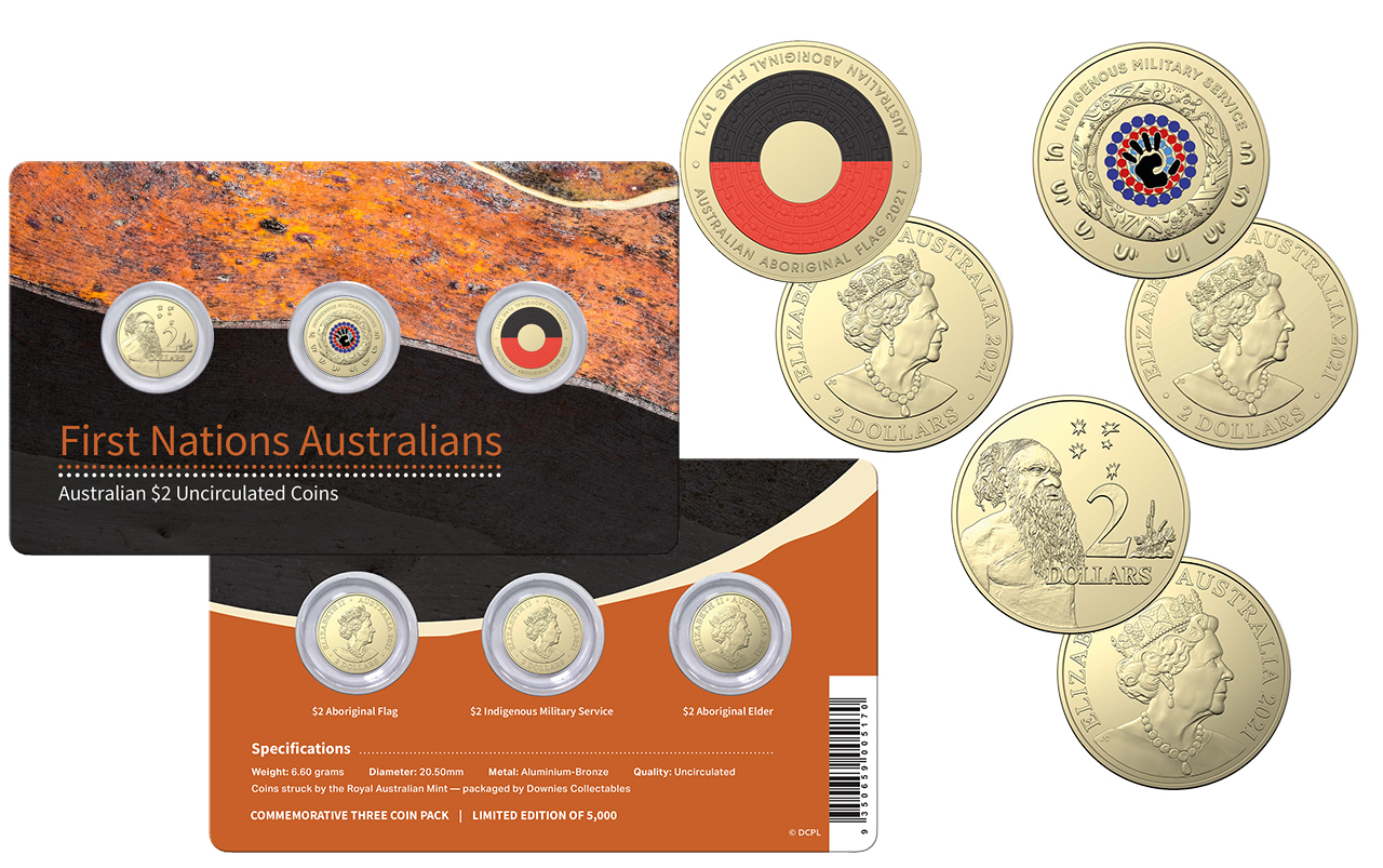 A must-have for all collectors, the First Nations Australians 2021 $2 3-Coin Set comprises the 2021 Indigenous Elder $2, 2021 Indigenous Military Service $2 and 2021 Australian Aboriginal Flag $2. Introduced in 1988, the Indigenous Elder $2 is now firmly entrenched as a classic decimal type, whilst the two full-colour coins found in this set form part of one of the hottest series in Australian coin collecting.
