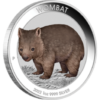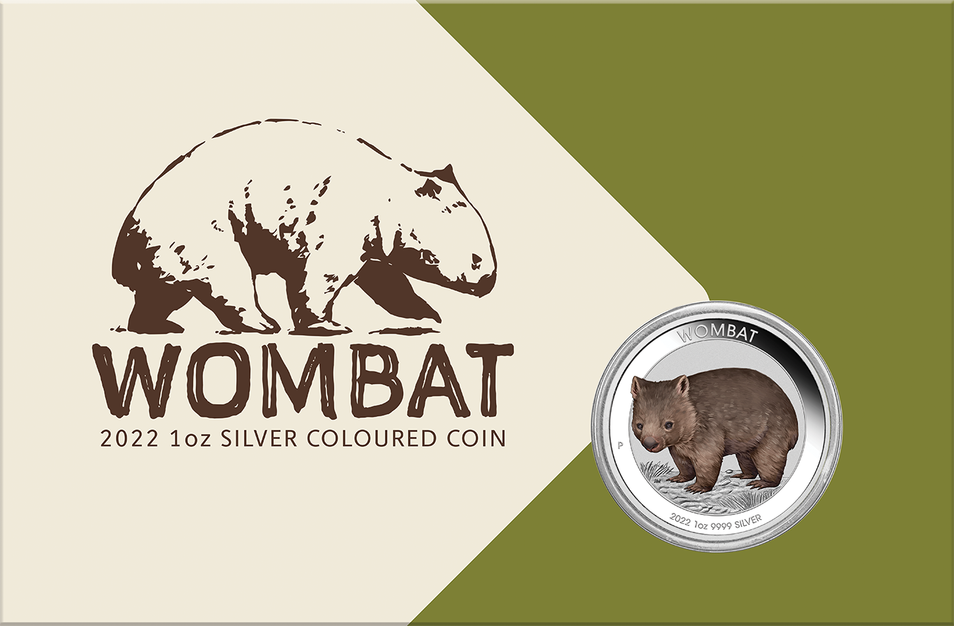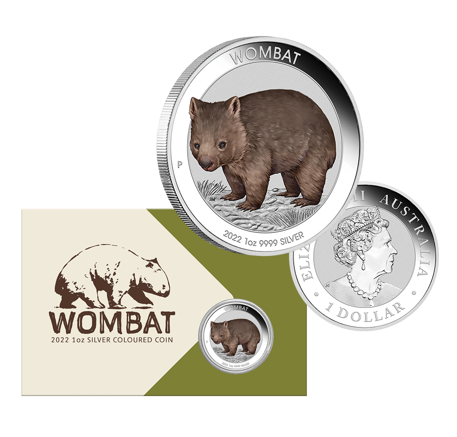 The coin portrays a coloured representation of one of Australia’s best-known marsupials – the wombat. As well as the inscription ‘WOMBAT’ and The Perth Mint’s ‘P’ mintmark, the reverse includes the coin’s weight, purity and 2022 year-date.