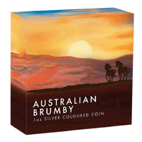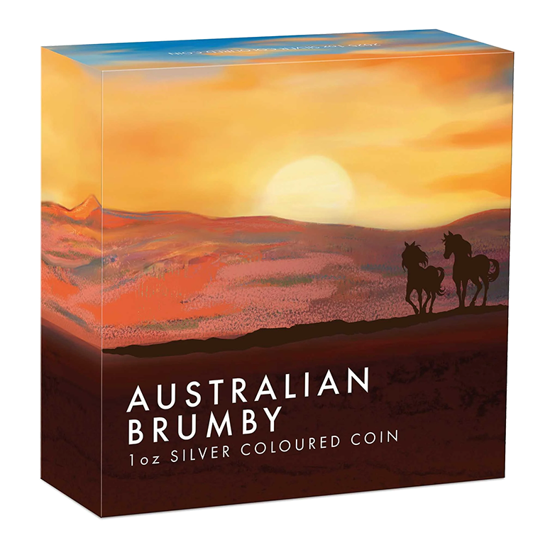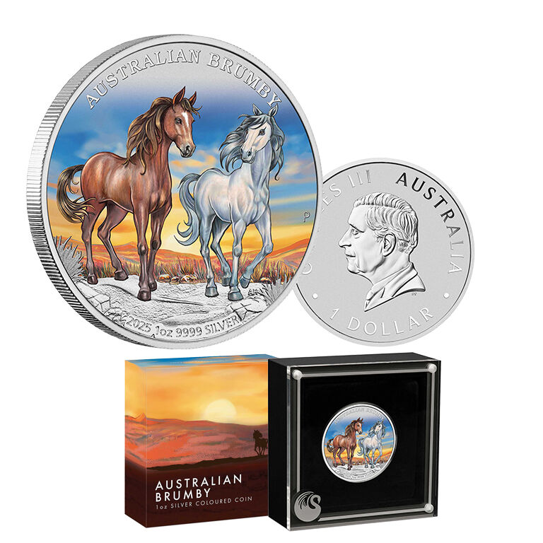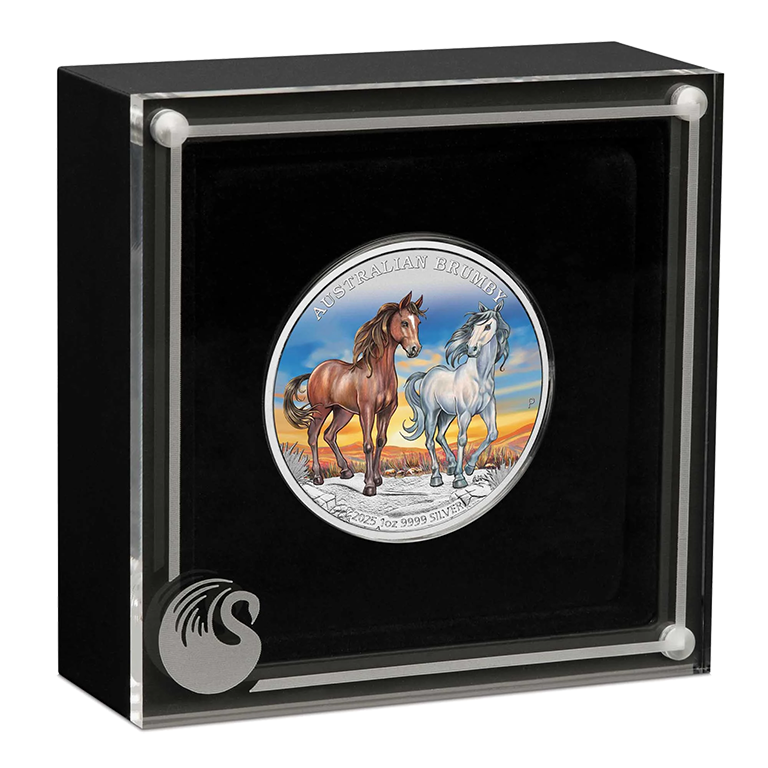 The coin portrays a brown and white coloured brumby majestically poised amidst an arid, barren landscape. The image is set against a backdrop of a breathtaking sunset and impressive mountain ranges. The design includes the inscription ‘AUSTRALIAN BRUMBY’, along with the coin’s weight, fineness, 2025 year-date, and The Perth Mint’s ‘P’ mintmark.