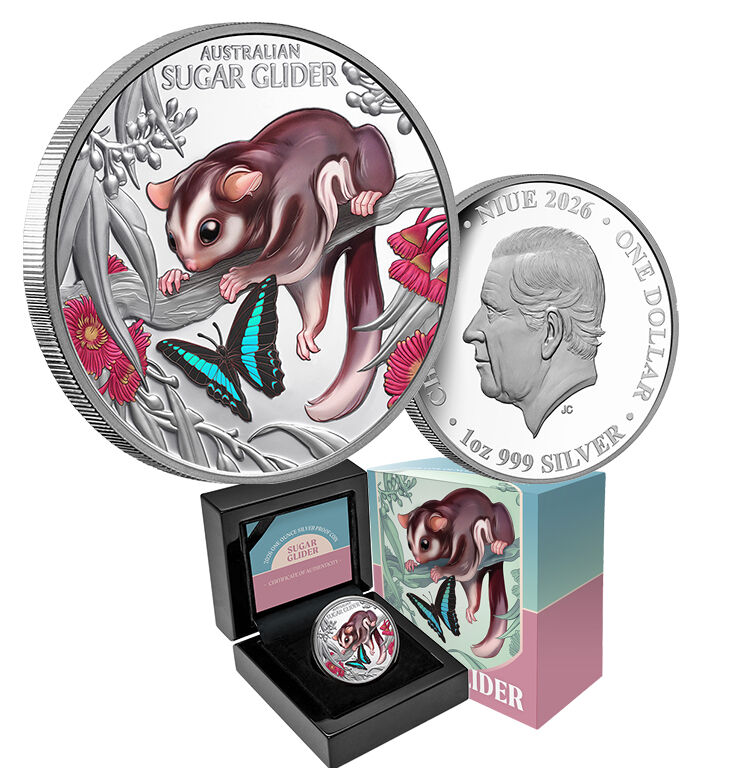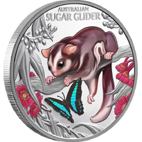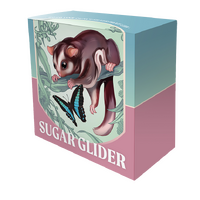 An enchanting addition to this internationally-admired collector series, this heart-warming new issue pays homage to the Sugar Glider – a nocturnal possum with a fondness for sugary foods and an ability to glide through the trees. Native only to a small area of south-eastern Australia, this lovable Aussie icon is superbly depicted in full-colour upon the large, crown-sized flan of this 99.9% silver Proof. The perfect finishing touch, the charming reverse motif also features a fluttering Blue Triangle Butterfly and flowering gum.
