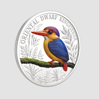 This 1oz Silver coin beautifully captures the bird’s vibrant colours through selective colouring. Perchedon a moss-covered branch and surrounded by finely detailed foliage, the design pays tribute to thespecies and the rich biodiversity of its rainforesthabitat. This coin brings to life what wildlifephotographers and enthusiast chase. The deep contrasts between polished silver and vivid huescreates a piece that is both elegant and lifelike.Issued by Ascension Island, this exclusive coin is limited to just 1,000 pieces worldwide. It ispresented in an elegant display package with a numbered certificate of authenticity, making it astandout addition to any nature or numismaticcollection.Website TextThe Oriental Dwarf Kingfisher is one of the smallest and most vividly coloured birds in the world.Native to the dense tropical forests of India, Southeast Asia, and the Philippines, it is known for itscompact size, striking appearance, and elusive nature.Measuring an average of just 13 cm, this bird features a glowing golden-orange body, deep violetcrown, and bright cobalt blue wings. The incredible bird rightfully earning it’s nick name of ‘The JewelOf The Forest’This 1oz Silver coin beautifully captures the bird’s vibrant colours through selective colouring. Perchedon a moss-covered branch and surrounded by finely detailed foliage, the design pays tribute to the