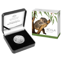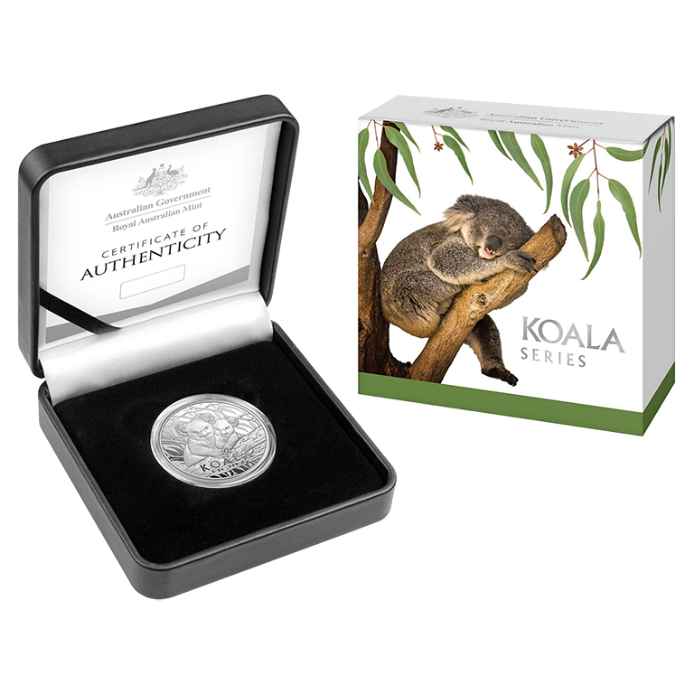 An exquisite mother and baby koala are depicted on this coin, further enhanced by its high relief detail. The much-loved koala species is instantly recognised by its thick fur, fluffy ears and broad nose. Its natural habitat is eucalyptus trees, with the leaves forming much of their diet. The second release in the Royal Australian Mint’s Koala Series, the coin, with proof finish, is accompanied by a Certificate of Authenticity.