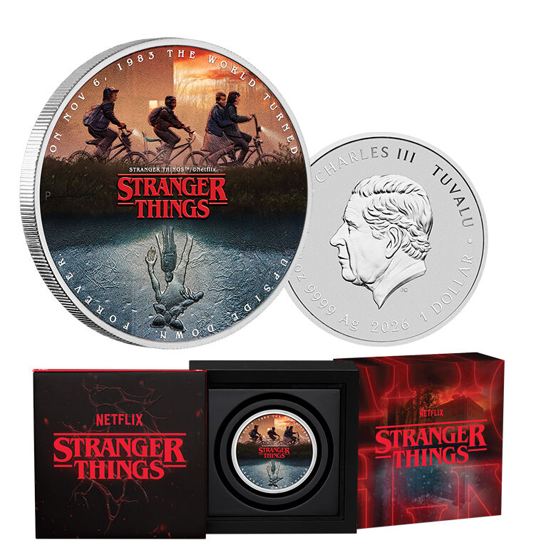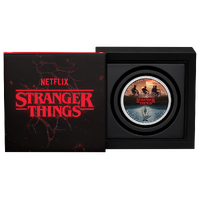 The coin’s coloured reverse features the mysterious world of Hawkins. The coin’s upper half showcases Mike, Dustin, Lucas, and Eleven on an adventurous bike ride, while the lower half features the eerie Upside Down, featuring Will and the ominous presence of the Demogorgon. Included in the design is the inscription “ON NOV 6, 1983 THE WORLD TURNED UPSIDE DOWN. FOREVER.", along with the “STRANGER THINGS" logo and The Perth Mint’s ‘P’ mintmark.