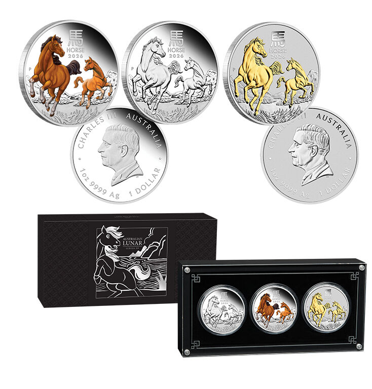 The Perth Mint is proud to present the 2026 Year of the Horse 1oz Silver Trio Set consisting of the Year of the Horse 1oz Silver Proof, 1oz Silver Coloured Proof and 1oz Silver Gilded Coins.