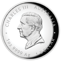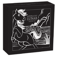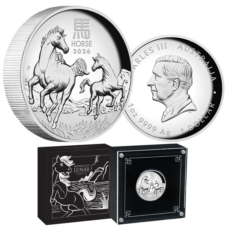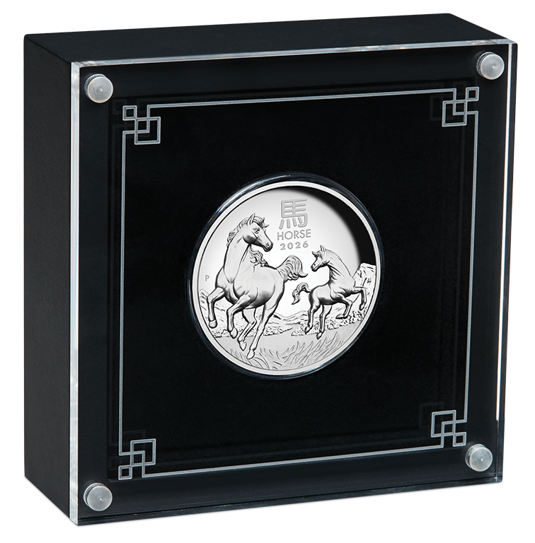 The coin’s reverse portrays a majestic mare alongside her young foal, both depicted with elegant manes in a striking galloping stance. The background includes an image of mountainous landscapes and grassland. Included in the design is the Chinese character for ‘Horse’, the inscription ‘HORSE 2026’, and The Perth Mint’s ‘P’ mintmark.