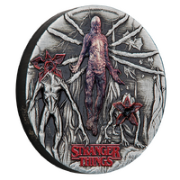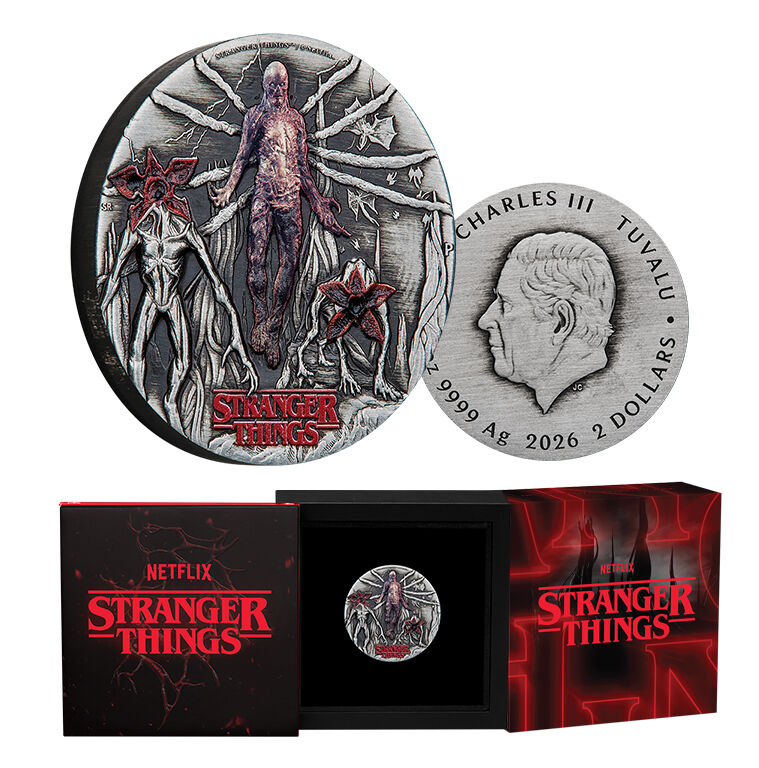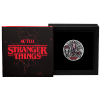The coin's coloured reverse showcases Vecna levitating, with eight tentacles extending from his body. The design includes two Demogorgons in the eerie Upside Down world, complete with demobats and flashes of lightning streaking across the night sky. The design includes the “STRANGER THINGS" logo along with The Perth Mint’s ‘P’ mintmark.