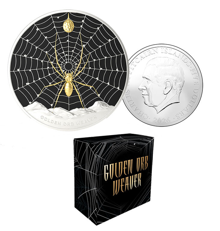 Renowned for weaving some of the strongest silk in the natural world,the Golden Orb Weaver is a true master of beauty and precision. Thisremarkable creature is brought to life in 1oz ofsilver, captured instunning detail as it moves across its web toward an egg sac of goldensilk. Selective gold plating highlights the spider, standing out beautifullyagainst the deep metallic black background.A subtle concave curve has been carefully incorporated into the coin,enhancing the natural shape of the web and drawing your eye toward thecentre of the design. The web itself is finely detailed, with delicatestrands spreading outward in a balanced, circular pattern. Each line iscarefully crafted to create depth and realism, giving the impression thatthe spider is suspended within its intricate creation.Limited to just 1,000 pieces worldwide, this release is both exclusive andhighly refined. Striking, elegant and rich in detail, the 1oz Silver GoldenOrb Weaver is a powerful tribute to one of nature’s most fascinatingarchitects.