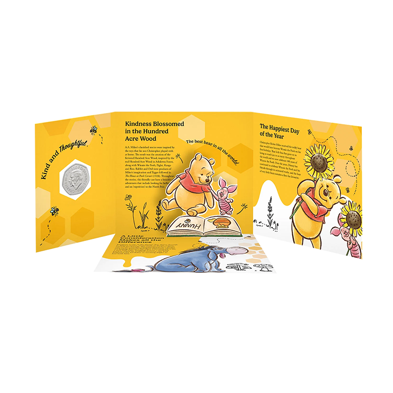 Now, The Royal Mint is proud to celebrate 100 years of Winnie the Pooh with a new three-coin collection. The first coin celebrates the theme of kindness, which is seen throughout the books in how Winnie the Pooh treats his friends and those he meets along the way. Available in a range of editions, including two that feature colour printing, this UK 50p coin features a reverse design created by The Walt Disney Company that depicts the courageous bear.