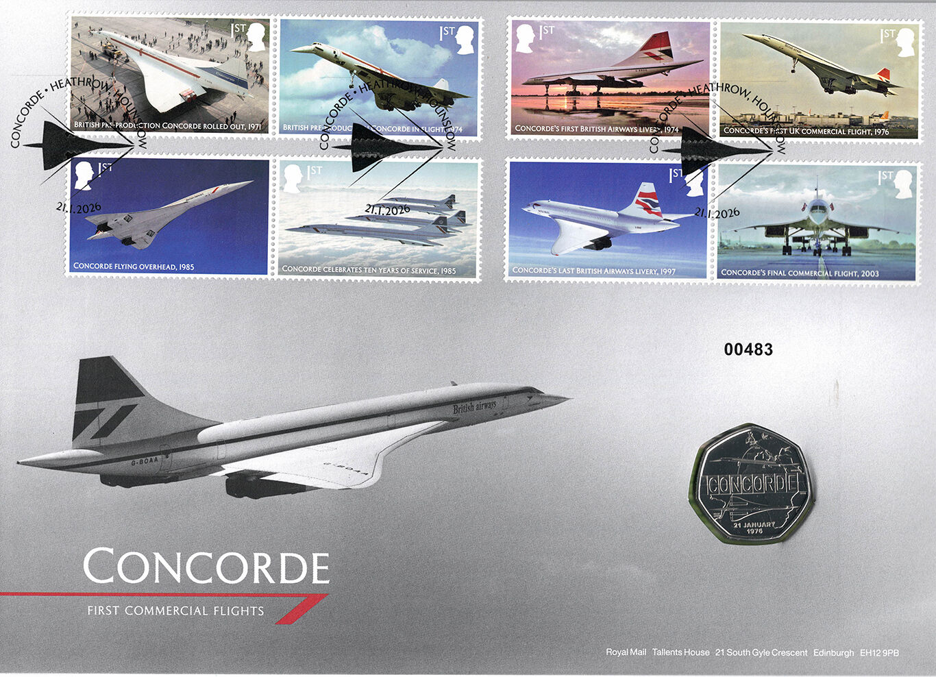 This limited-edition souvenir pairs the Royal Mint’s official Concorde 50p coin with Royal Mail’s stamps celebrating the 50th anniversary of Concorde’s first commercial flight. The Royal Mint’s official Concorde 50p Brilliant Uncirculated coin is beautifully presented on an individually numbered, limited-edition souvenir featuring the commemorative issue’s eight main stamps.