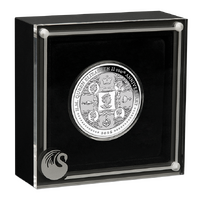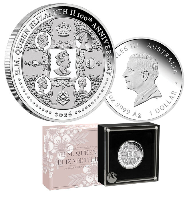 Commonwealth. Arranged clockwise from the top, are motifs of St Edward’s Crown, the Sovereign’s Orb, Tudor rose, and Sovereign’s Sceptre—each signifying key elements of royal tradition and authority.Surrounding the design is the inscription “H.M. QUEEN ELIZABETH II 100th ANNIVERSARY”, accompanied by stylised dots, the 2026 year-date, and The Perth Mint’s ‘P’ mintmark.The coin’s obverse depicts the Dan Thorne effigy of His Majesty King Charles III, along with the coin’s weight, fineness and monetary denomination.