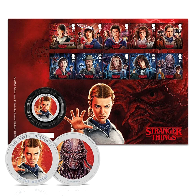 The 10 main stamps appear above an exclusive medal depicting Eleven on the front and Vecna on the reverse.