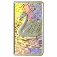 The design features an elegant swan in raised silver relief, set against a vivid hologram background inspired by flowing water. As light moves across the surface, the colours shift dynamically, bringing the scene to life.