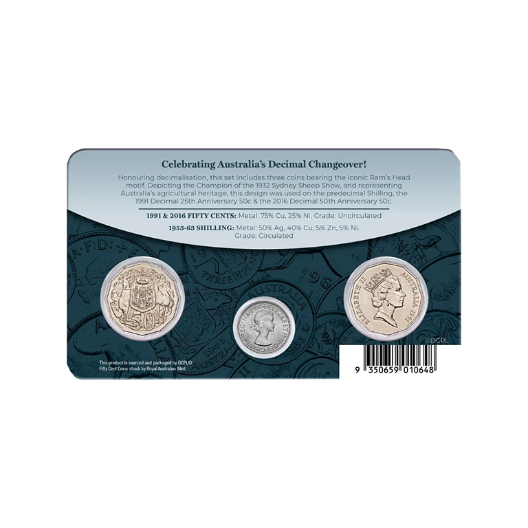 Representing Australia’s agricultural heritage, Kruger Gray’s Ram’s Head design first featured upon the predecimal silver shilling, including the Queen Elizabeth II 1953-63 Shilling. The motif was superbly adapted by Horst Hahne for the 1991 Decimal 25th Anniversary 50c, and then employed on Australia’s one & only 50c ‘obverse commemorative’ – the 2016 Decimal 50th Anniversary 50c. Beautifully presented within an illustrated, informative pack, all three key Australian legal tender types are included in this set!