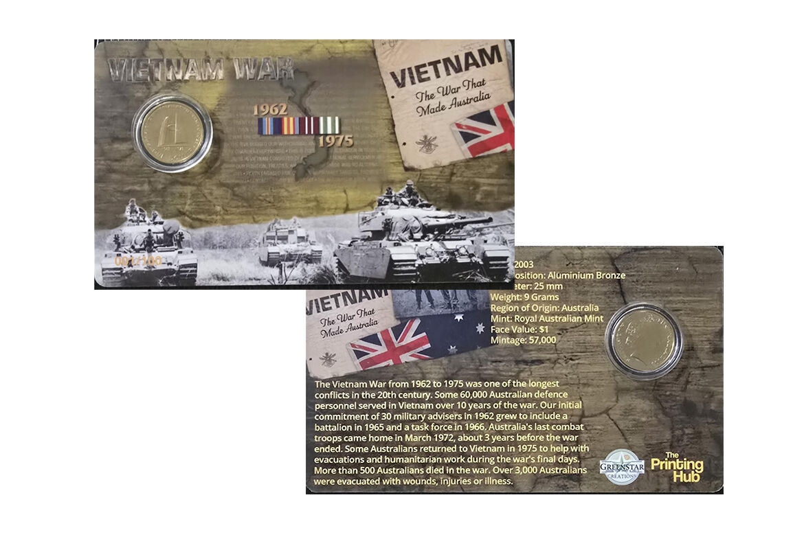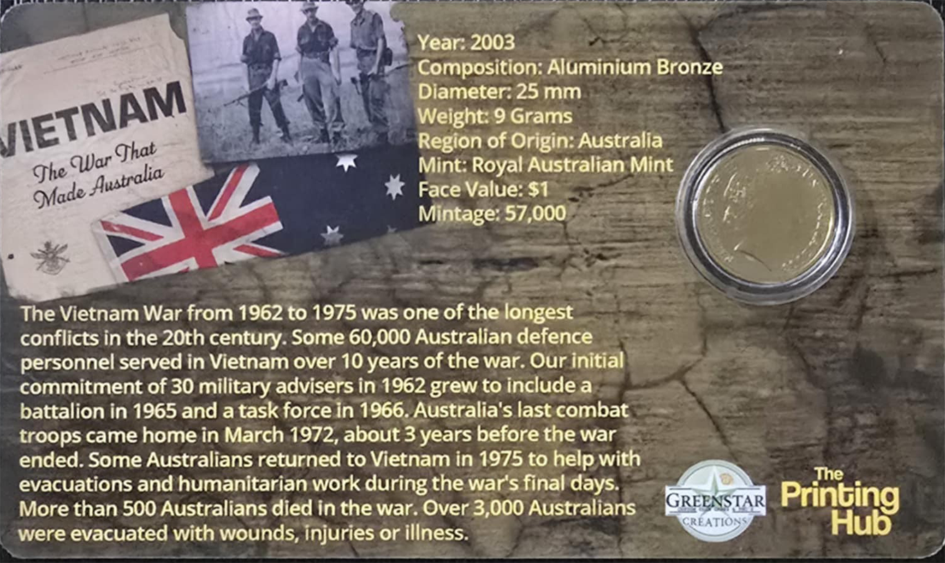 Featuring a 2003 $1 Vietnam Coin minted by the Royal Ausralian Mint to commemorate Austrlia's Vietnam Forces.